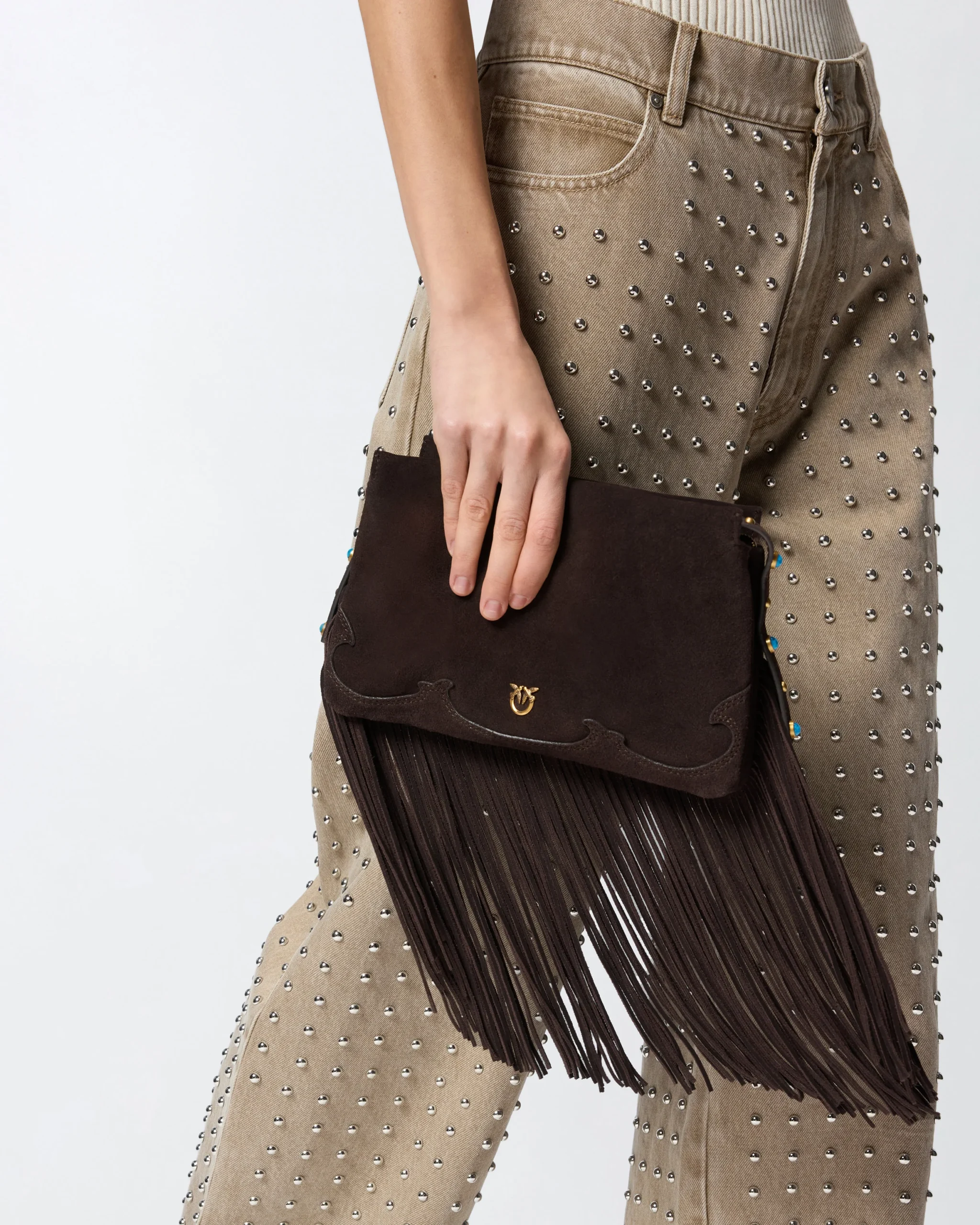 - Alça ajustável e removível em pele e corrente;